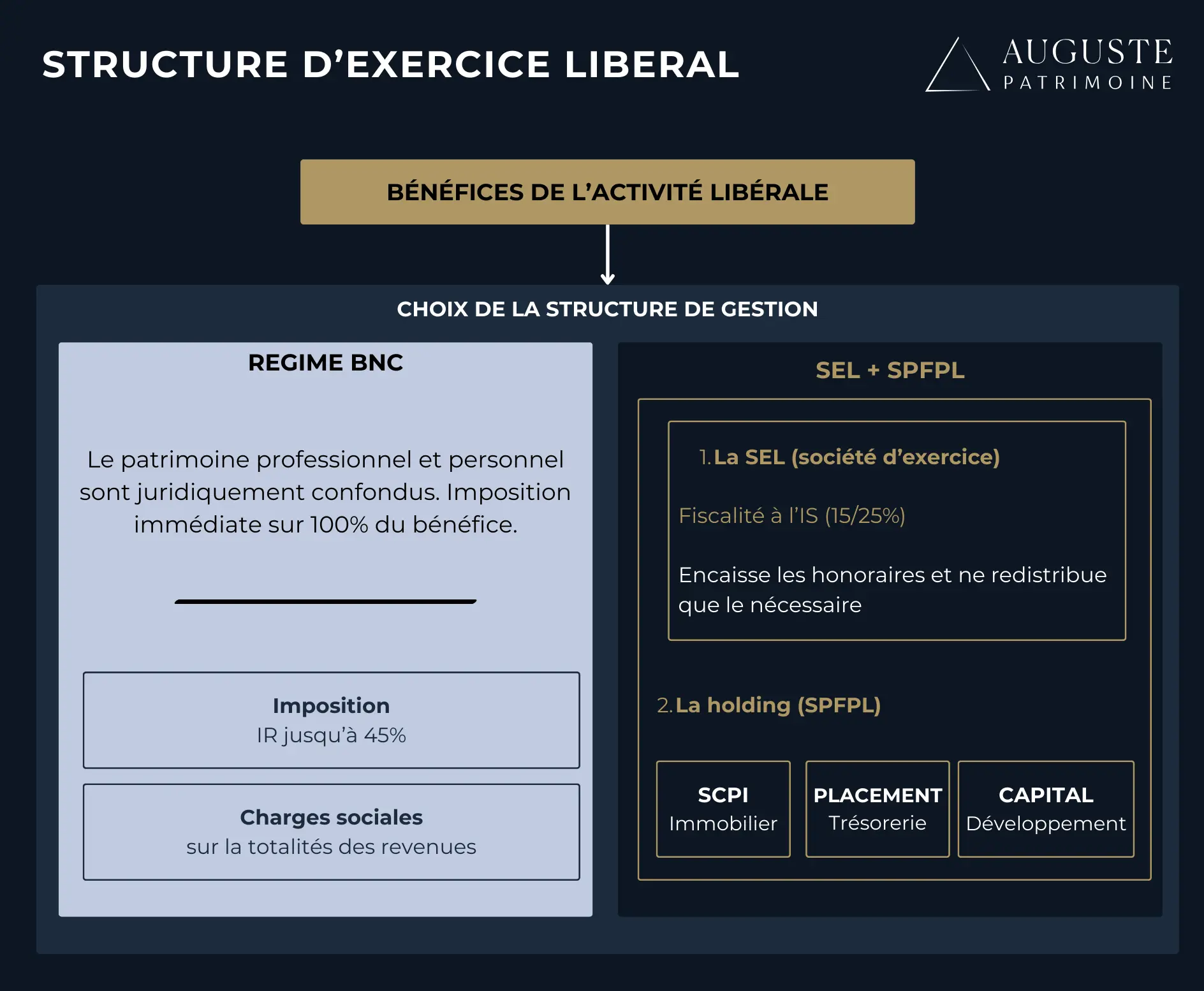 L'exercice en société d'exercice libéral (SELARL ou SELAS) permet de soumettre les bénéfices à l'impôt sur les sociétés (IS) au lieu de l'impôt sur le revenu (IR). Le taux réduit d'IS s'établit à 15% sur les 42 500 premiers euros de bénéfice, puis à 25% au-delà. Ce différentiel devient avantageux lorsque le bénéfice annuel dépasse un seuil indicatif d'environ 100 000 €.